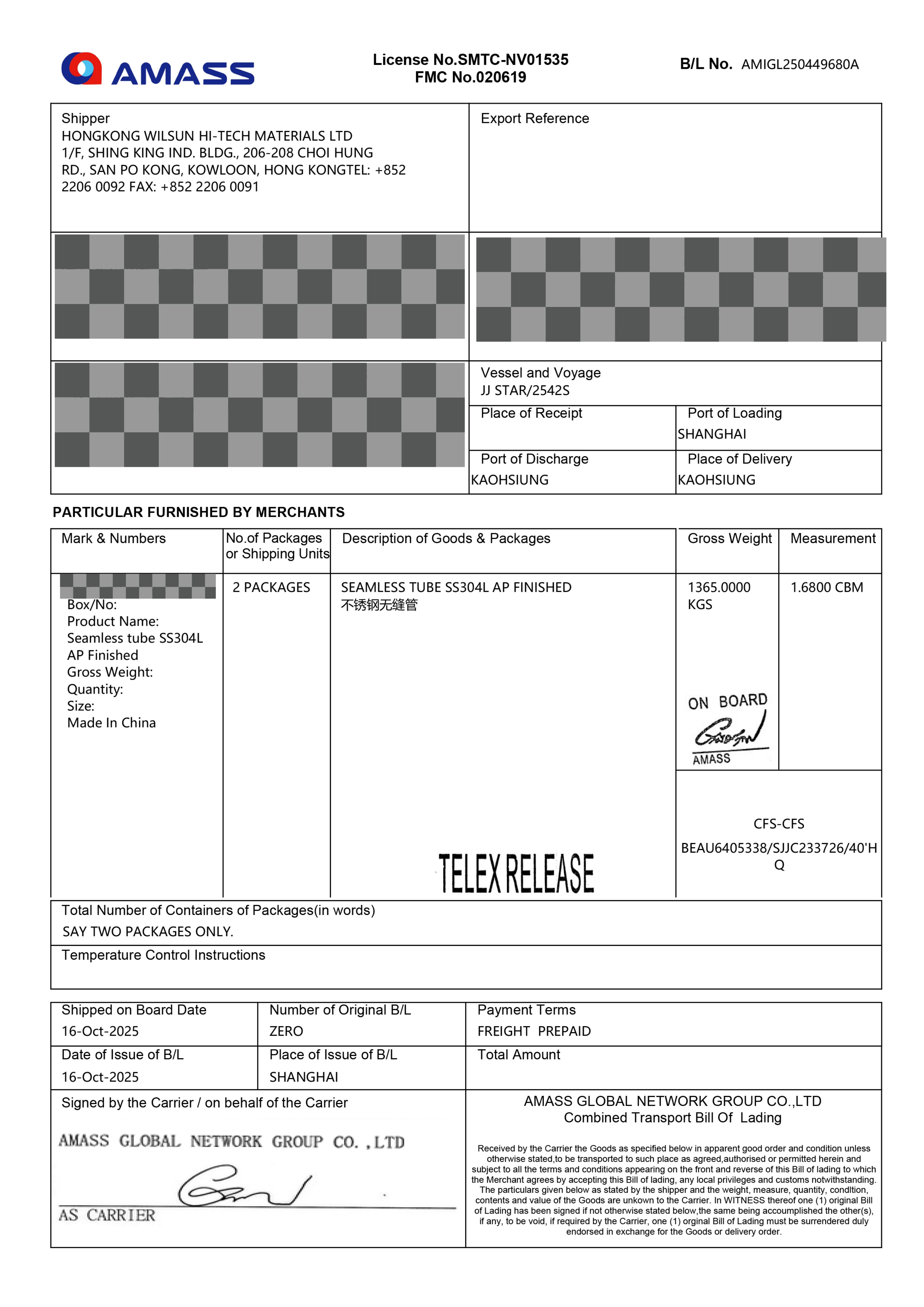 Wilsun Alloy Exp. Order No.1536-1