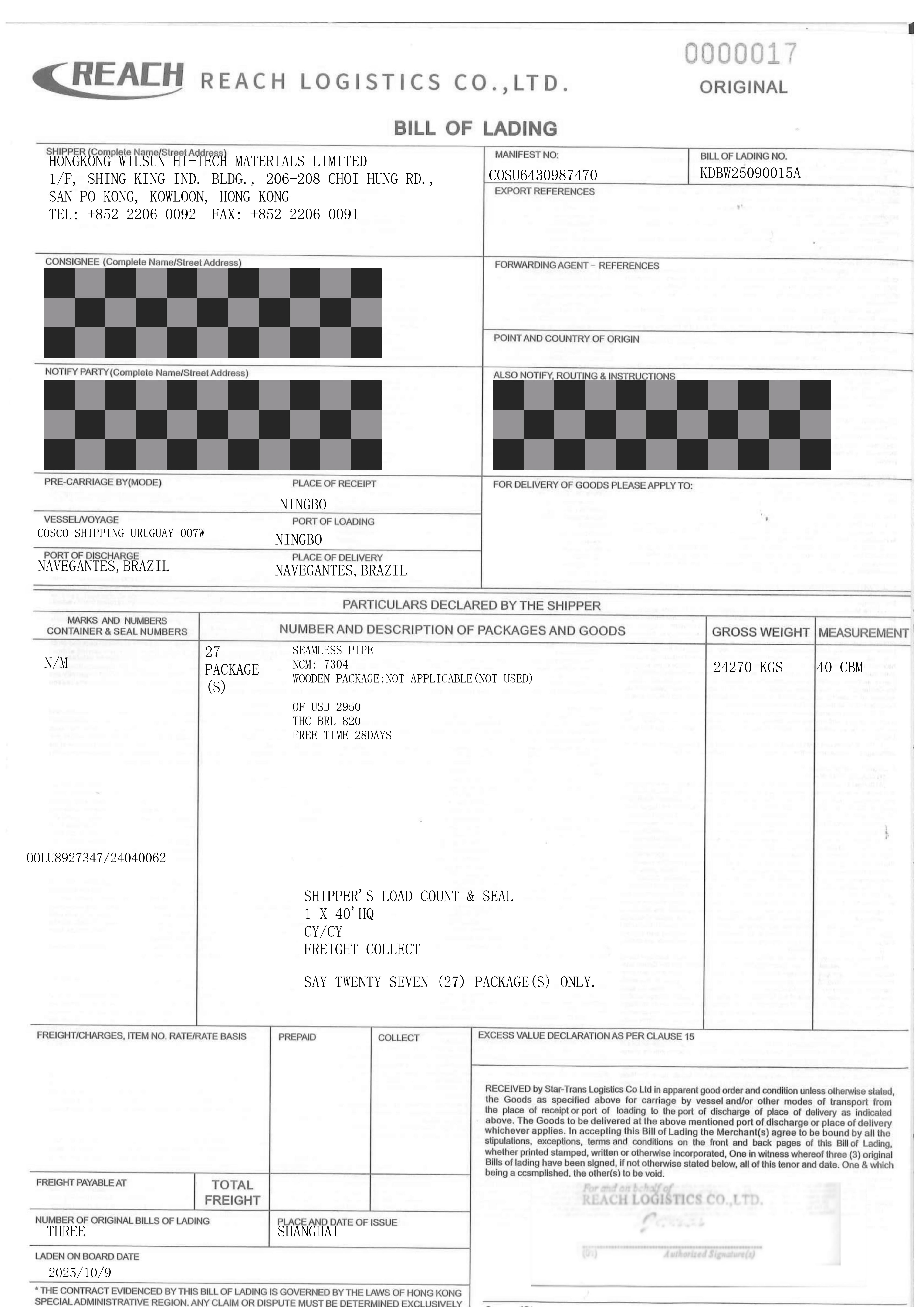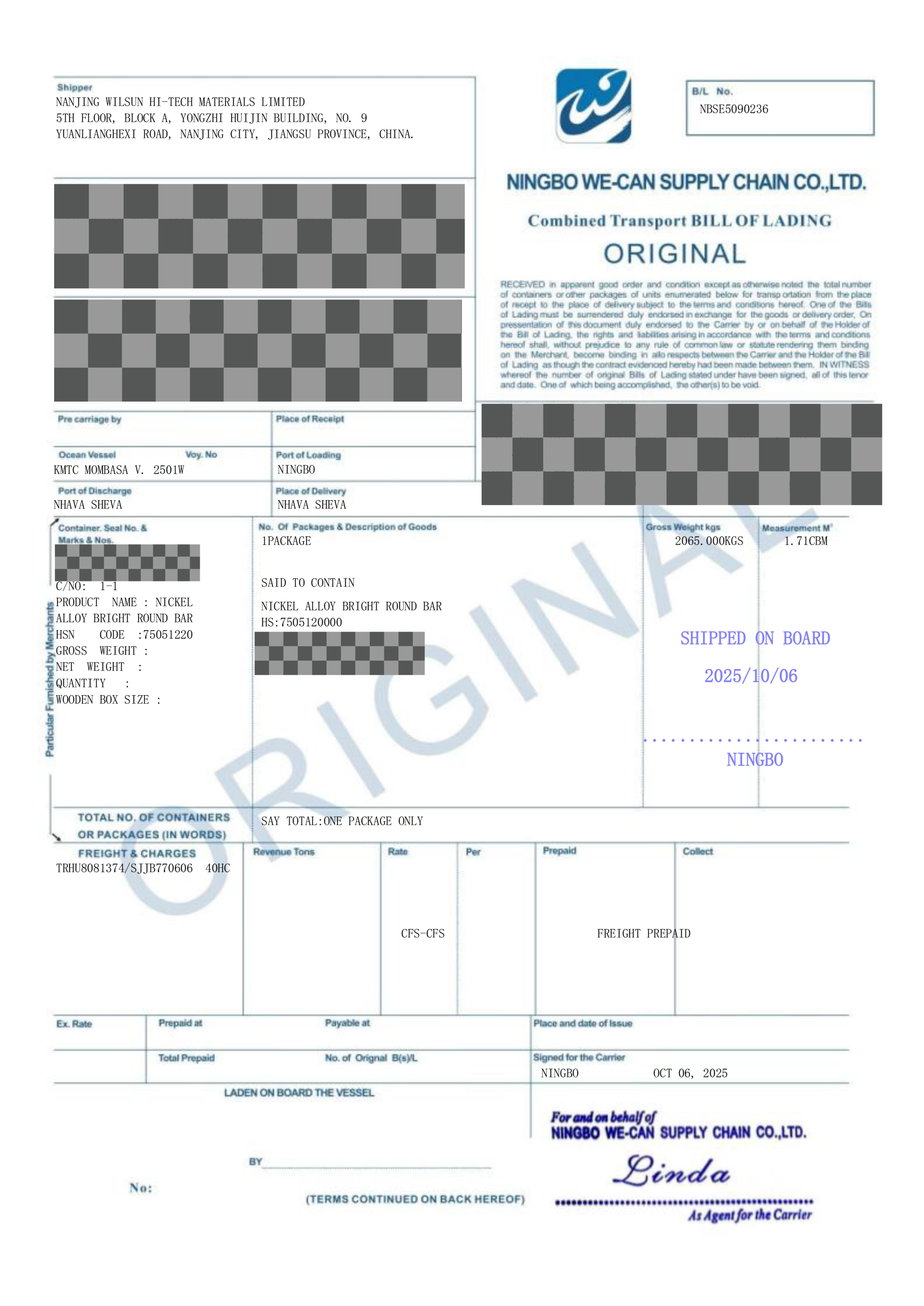 Wilsun Alloy Exp. Order No.1509